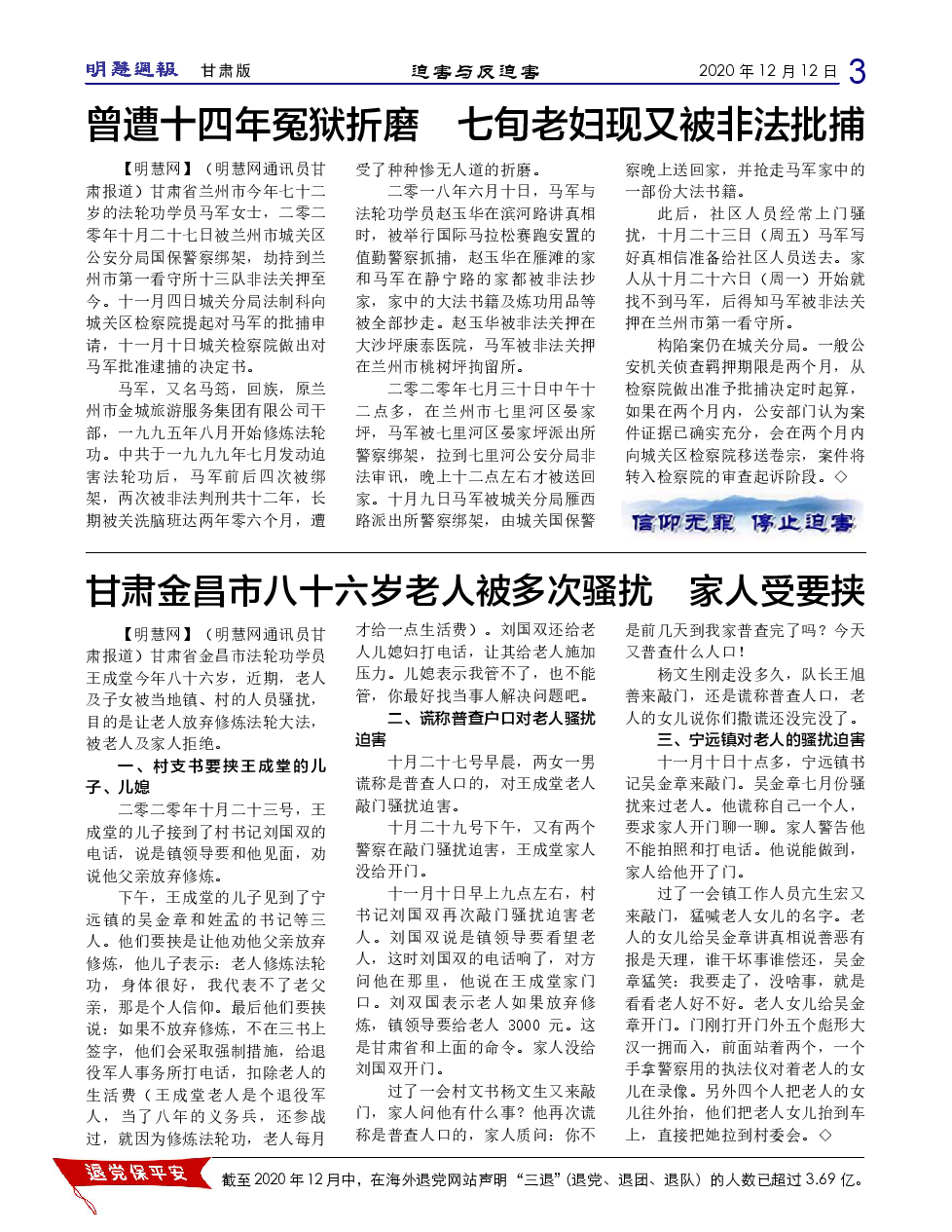 《明慧周报:甘肃版》 第 334 期,2020年12月12日出版